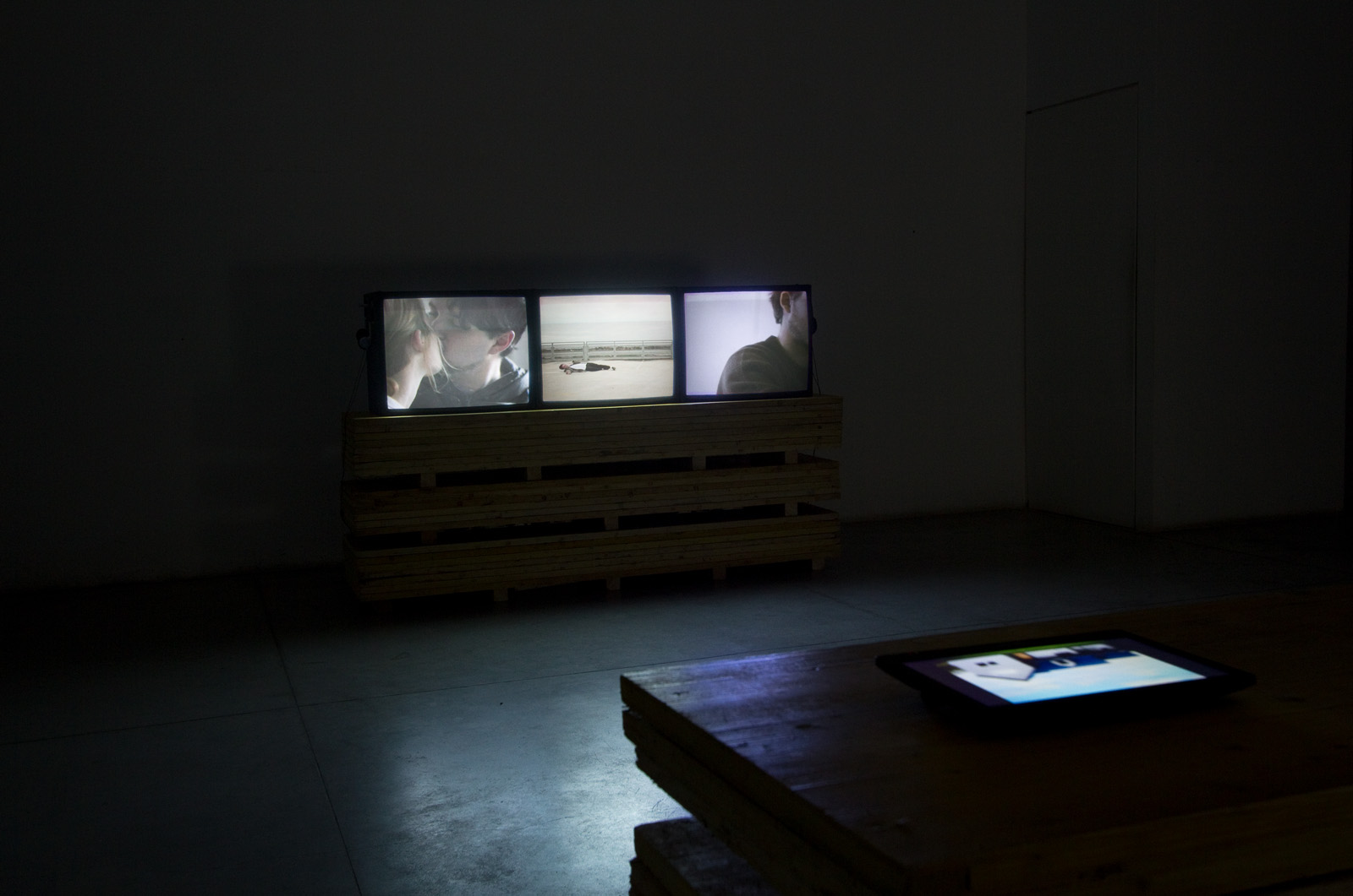 Jacqui Shelton and Tim Casten’s video work Screens presents cinematic imagery that evokes narratives without resolution. Spanning three channels, the work consists of three narrative fragments played simultaneously, with each television showing a single location. Screens expands familiar cinematic narratives, both spatially and temporally, in order to present a new way to generate narratives that are physically located in their material space, while also evoking the ephemeral connections produced by memory.