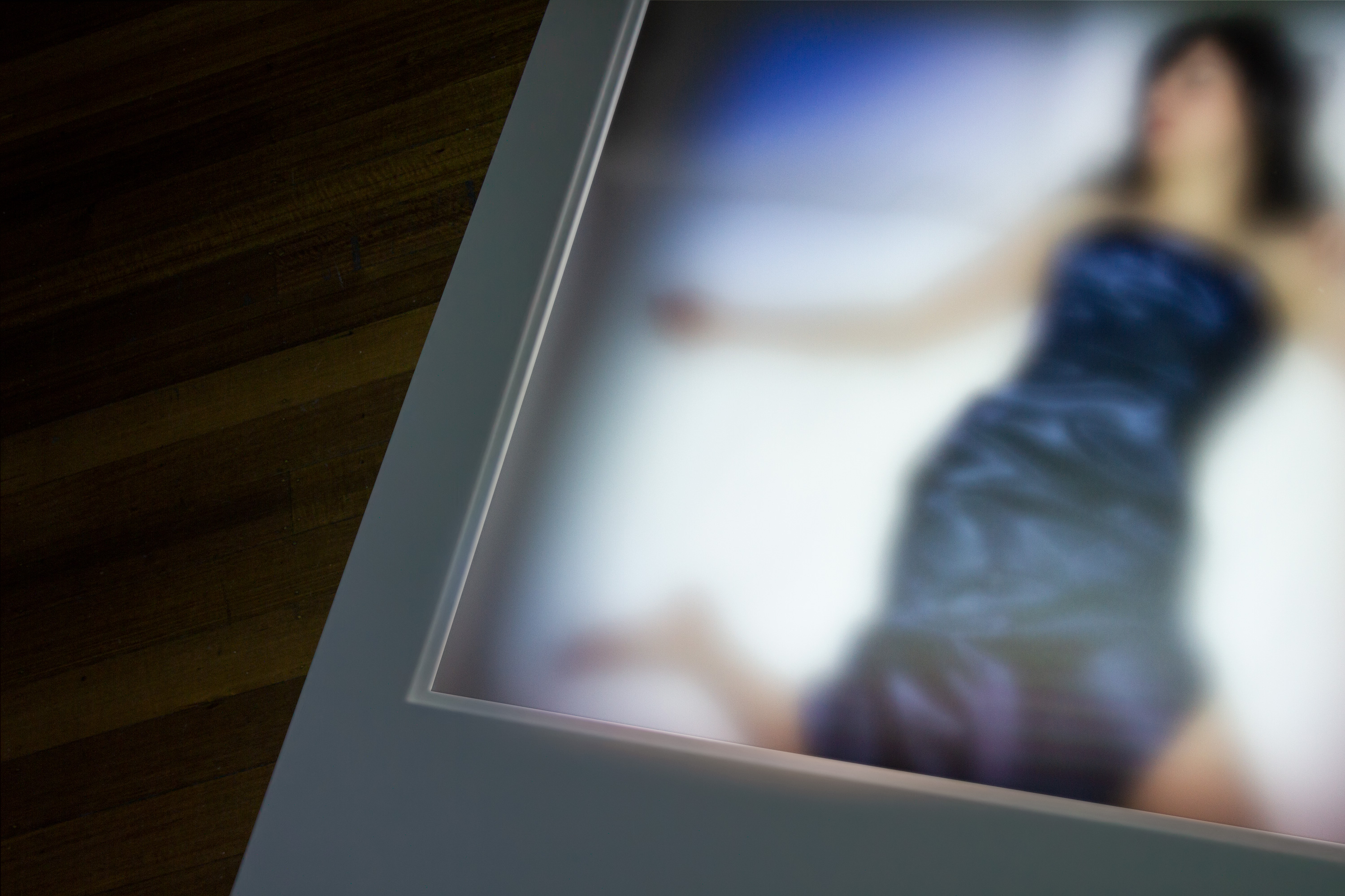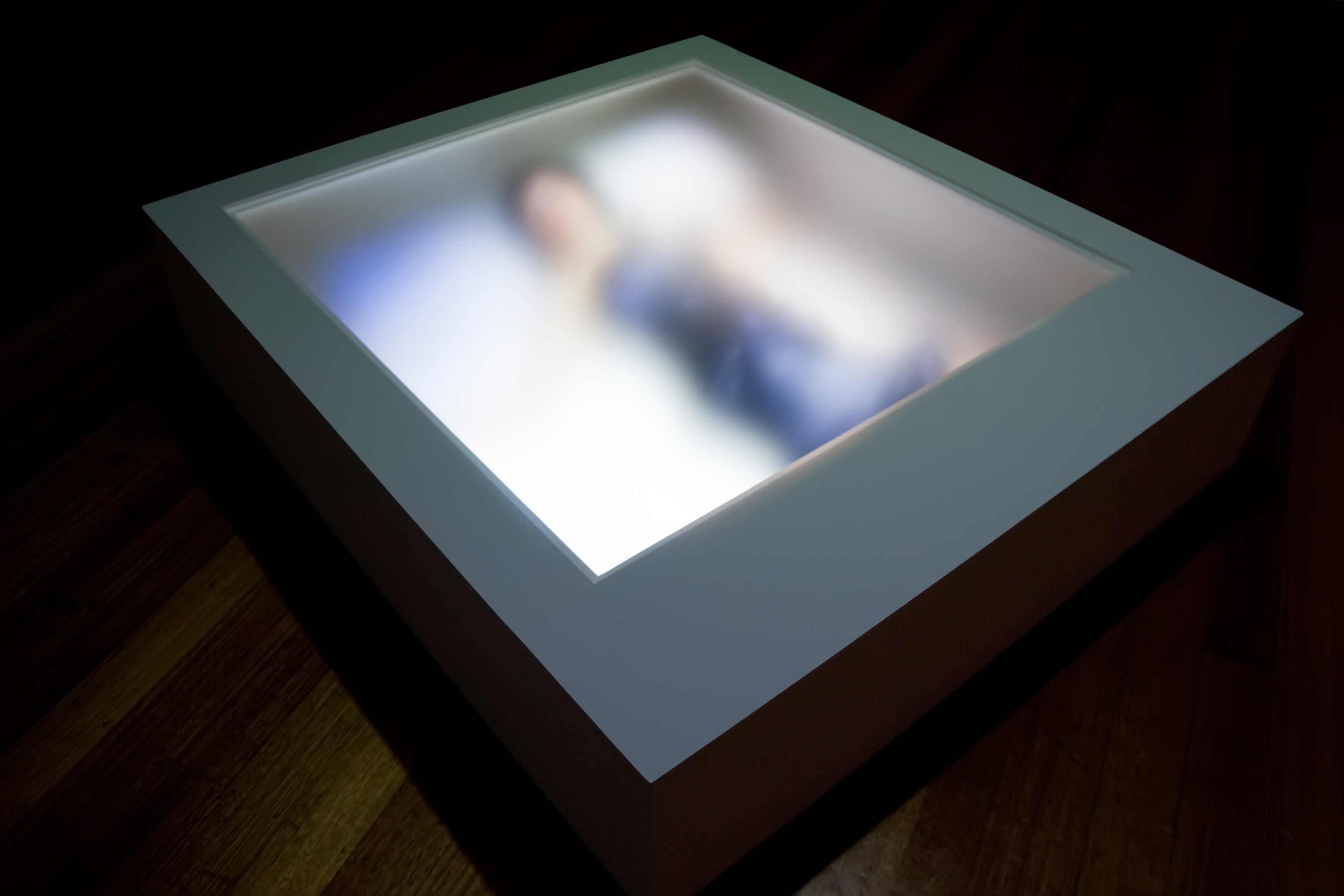 When the viewer moved beyond the suspended screen, a white box positioned on the floor, with the horizontal dimensions of a Polaroid photograph, became visible. This structure had a piece of frosted Perspex where the image would be in a Polaroid photograph. The box was illuminated by a video projection that provided light in a way that replicated the uneven colour distribution typical of a Polaroid photograph. Inside this box was a woman (the artist) lying in the same position as the woman depicted in the video. The live performer though still, exists always in motion, if only via the necessary act of breathing.