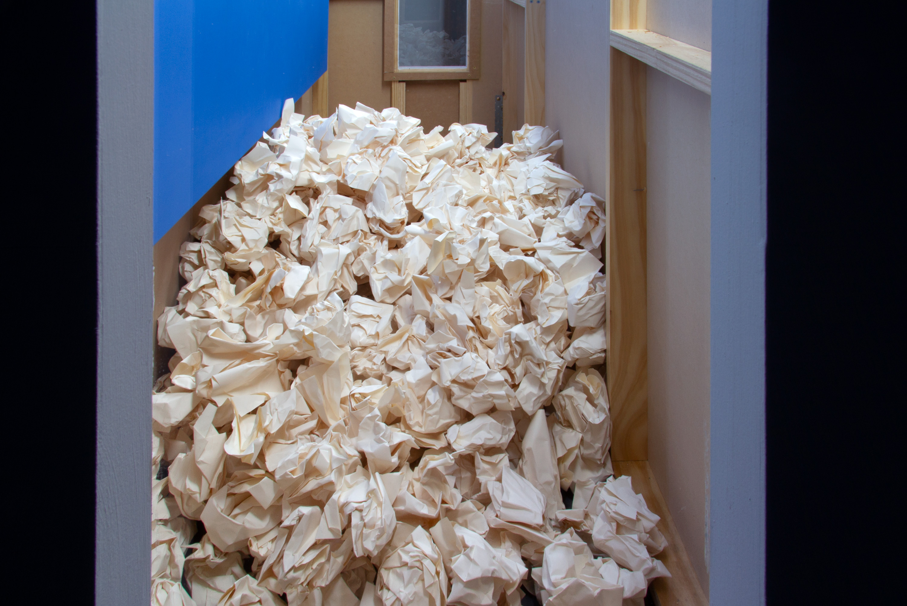 Running for two-days only, the work incorporated a performance element for the two-day duration of the exhibition. Set in a 1950s office, the work focuses on a simple gesture that is repeated. Mediated through video, the gesture repeats infinitely, but when performed live this same gesture is approximated through repetition.